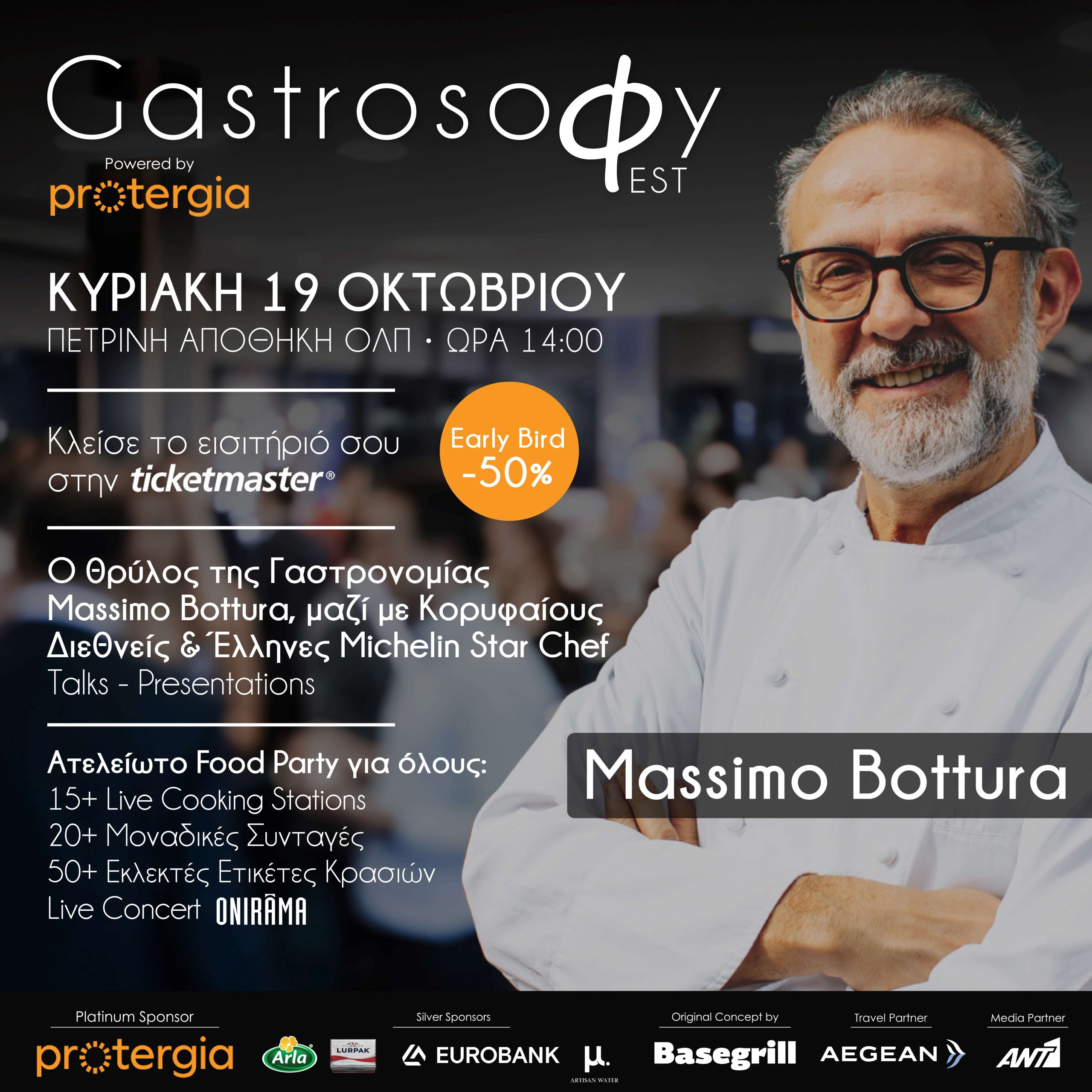 Το GastrosoΦy Fest powered by Protergia κάνει πρεμιέρα την Κυριακή 19 Οκτωβρίου 2025 στην Πέτρινη Αποθήκη του ΟΛΠ και υπόσχεται να αναδείξει την Ελλάδα ως κορυφαίο προορισμό γεύσης και πολιτισμού. Με κεντρικό καλεσμένο τον παγκοσμίου φήμης σεφ Massimo Bottura, ιδιοκτήτη του τριών αστέρων Michelin εστιατορίου Osteria Francescana στη Μόντενα, το φεστιβάλ φέρνει στην Αθήνα κορυφαία ονόματα της διεθνούς και ελληνικής γαστρονομίας.
