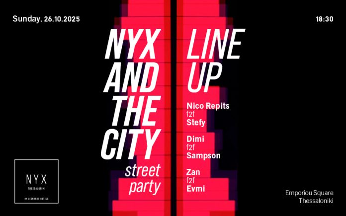 Το NYX Hotel Thessaloniki γιορτάζει επίσημα την άφιξή του με το “NYX AND THE CITY”, ένα ανοιχτό urban party αφιερωμένο στη μουσική, τη δημιουργικότητα και την ενέργεια της πόλης. Την Κυριακή 26 Οκτωβρίου, από τις 18:30, η Πλατεία Εμπορίου μεταμορφώνεται σε ένα μουσικό playground, όπου οι ήχοι της πόλης μπλέκονται με ηλεκτρονικά beats και φως.