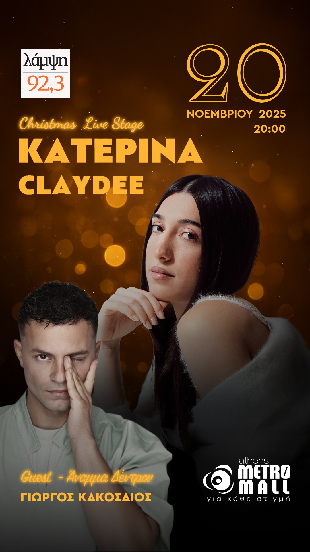 Στις 20:00, ο Γιώργος Κακοσαίος θα δώσει το σύνθημα για το άναμμα του δέντρου, φωτίζοντας την επίσημη έναρξη των γιορτών στο Athens Metro Mall. Αμέσως μετά, η εορταστική σκηνή θα φιλοξενήσει την Κατερίνα Κακοσαίου, που ξεχωρίζει ήδη στη νέα γενιά καλλιτεχνών, καθώς και τον Claydee, τον διεθνή hitmaker που υπόσχεται να απογειώσει το κέφι με τις μεγάλες του επιτυχίες.