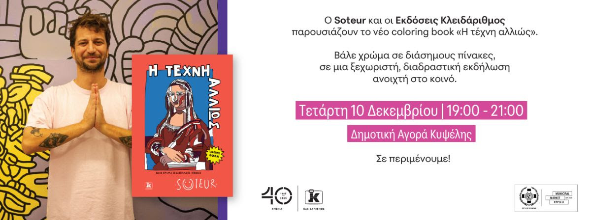 Οι Εκδόσεις Κλειδάριθμος και ο Soteur (Σωτήρης Φωκέας) προσκαλούν το κοινό σε μια ανοιχτή, διαδραστική εκδήλωση με αφορμή την κυκλοφορία του νέου coloring book Η τέχνη αλλιώς. Πρόκειται για μια μοναδική εμπειρία που προσφέρει σε μικρούς και μεγάλους την ευκαιρία να «επανερμηνεύσουν» διάσημα έργα τέχνης μέσα από το χρώμα.