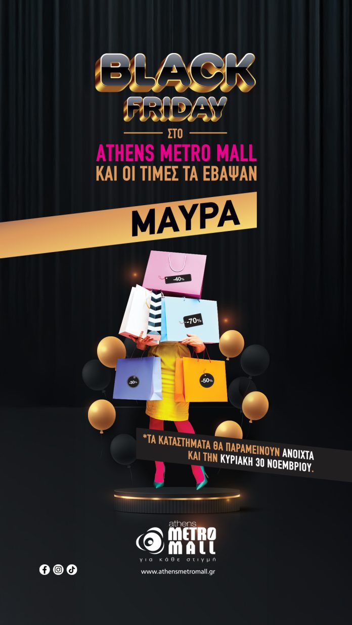 Το ATHENS METRO MALL ετοιμάζεται για το πιο πολυαναμενόμενο shopping date της χρονιάς, καθώς οι Black Friday προσφορές επιστρέφουν και… τα βάφουν μαύρα σε 95 επώνυμα καταστήματα μόδας, τεχνολογίας, ομορφιάς και ειδών σπιτιού! Οι καταναλωτές θα βρουν εκπτώσεις που φτάνουν έως και 70%, στα μεγαλύτερα brands που αγαπούν.