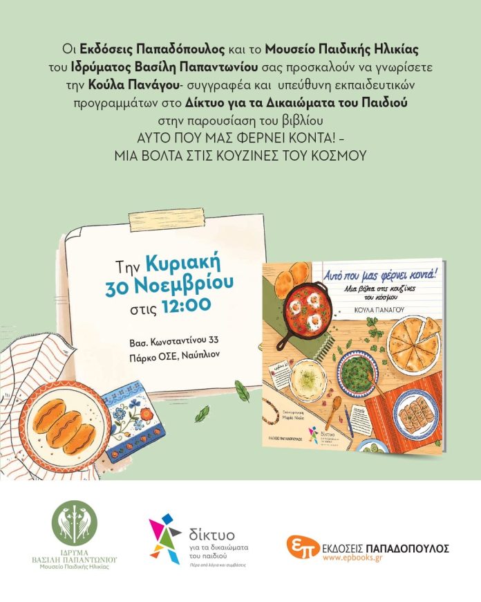 Η εκπαιδευτικός και συγγραφέας Κούλα Πανάγου, υπεύθυνη εκπαιδευτικών προγραμμάτων στο Δίκτυο «Δικαιώματα για το Παιδί», θα παρουσιάσει το βιβλίο και θα μυήσει τα παιδιά σε γεύσεις, υλικά και συνταγές διαφορετικών χωρών, μέσα από διαδραστικές δράσεις που καλλιεργούν τη δημιουργικότητα και την ανθρώπινη επαφή. Μαζί της θα βρίσκονται και οι κούκλες–ήρωες της ιστορίας, ζωντανεύοντας τη μαγεία του βιβλίου.
