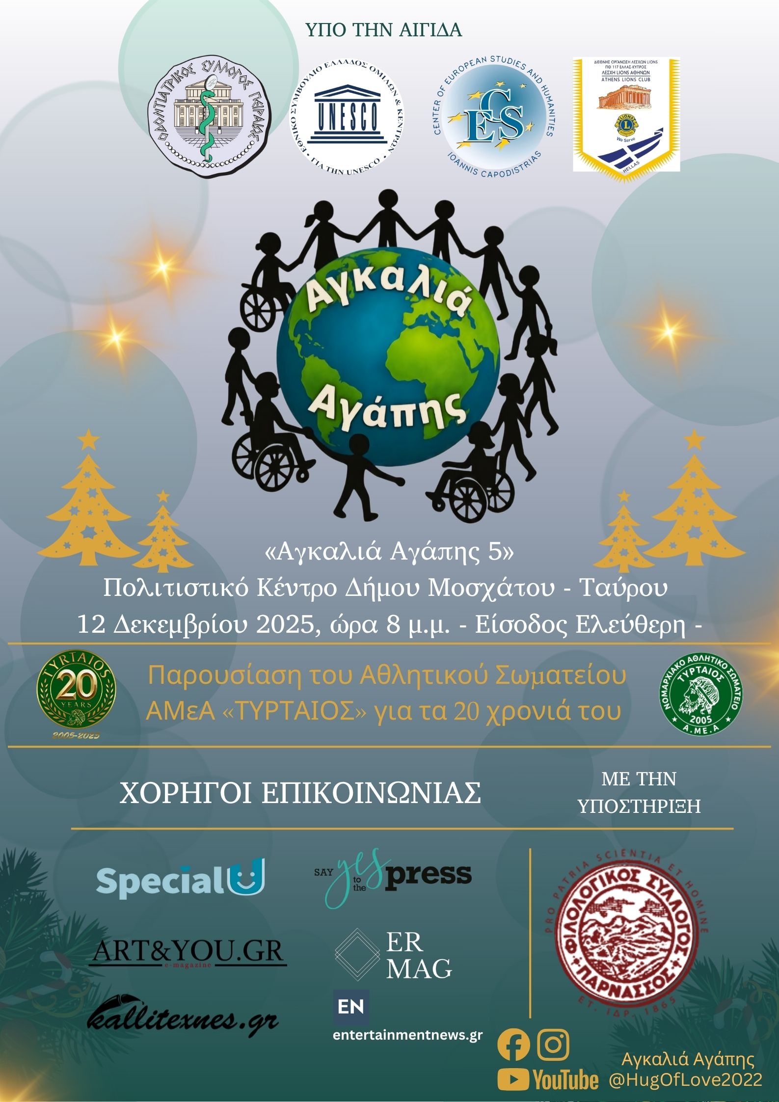 Η εκδήλωση «Αγκαλιά Αγάπης» επιστρέφει για πέμπτη συνεχόμενη χρονιά, την Παρασκευή 12 Δεκεμβρίου 2025, στις 8 μ.μ., στο Πολιτιστικό Κέντρο Δήμου Μοσχάτου–Ταύρου (Σολωμού 30). Με ελεύθερη είσοδο και στο επίκεντρο το μήνυμα της αλληλεγγύης, της συμπερίληψης και της αποδοχής, ο θεσμός συνεχίζει να φωτίζει με τον δικό του τρόπο τις ιστορίες και τις δυνατότητες των ανθρώπων με αναπηρία.