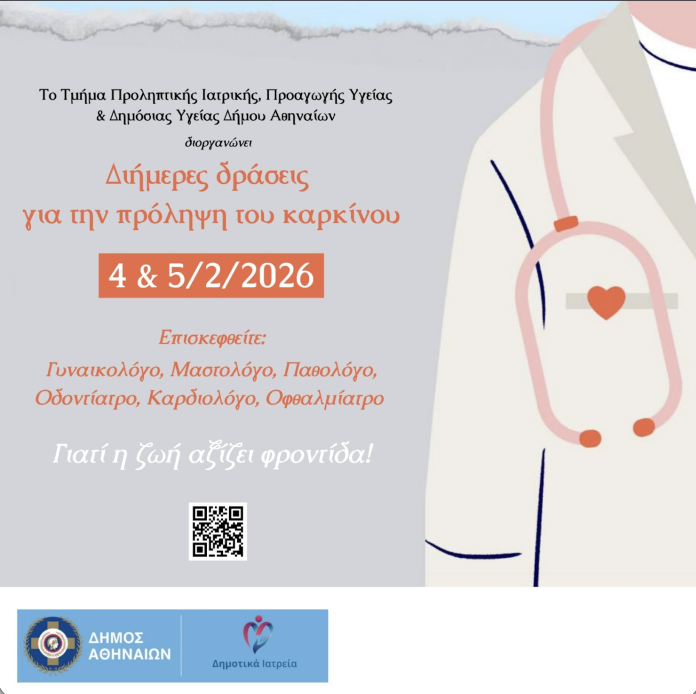 Με αφορμή την Παγκόσμια Ημέρα Κατά του Καρκίνου και με σταθερό προσανατολισμό στην πρόληψη και τη φροντίδα της δημόσιας υγείας, ο Δήμος Αθηναίων διοργανώνει διήμερο δωρεάν προληπτικών εξετάσεων για τον καρκίνο, σήμερα Τετάρτη 4 και την Πέμπτη 5 Φεβρουαρίου, στα Πολυδύναμα Δημοτικά Ιατρεία της πόλης.