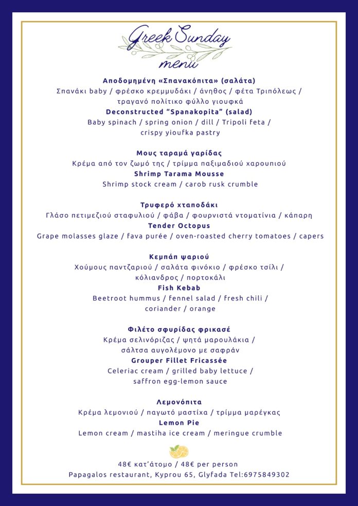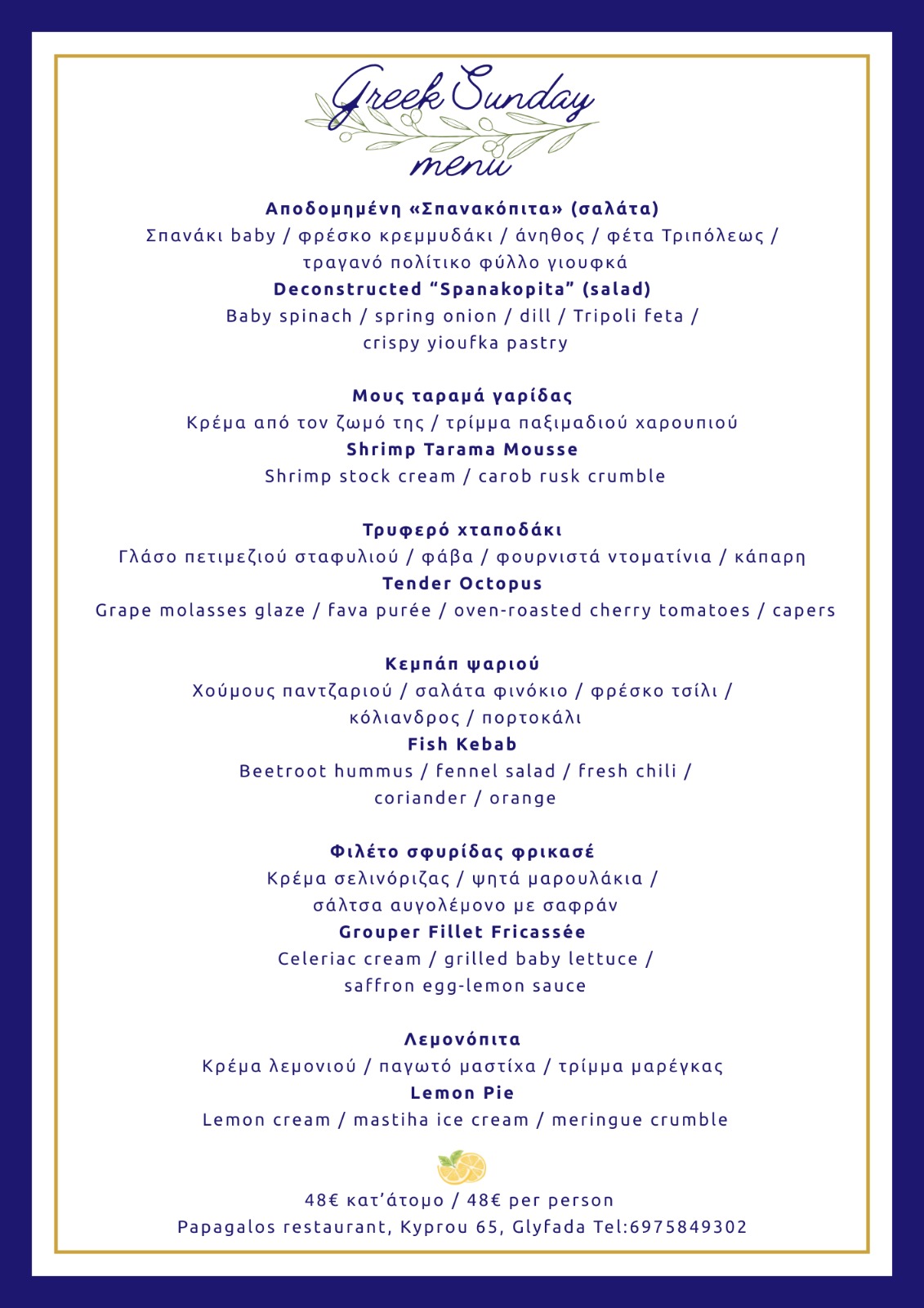 Το Greek Sunday απευθύνεται σε όσους αγαπούν την ελληνική κουζίνα αλλά και σε εκείνους που αναζητούν μια ολοκληρωμένη εμπειρία εξόδου, ιδανική για οικογένειες, φίλους και παρέες. Γιατί η Κυριακή, στο Papagalos, είναι πάνω απ’ όλα μοίρασμα.