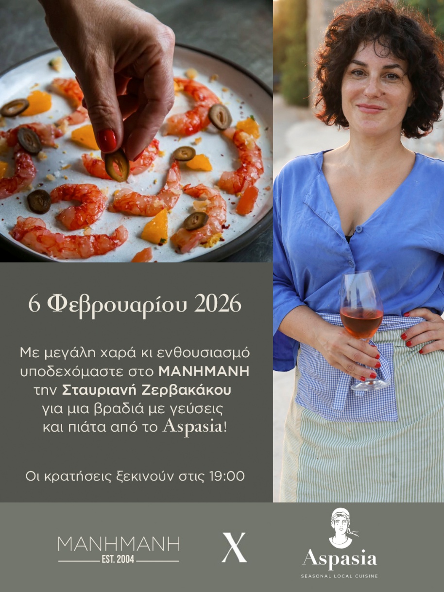 Την Παρασκευή 6 Φεβρουαρίου, το ΜΑΝΗΜΑΝΗ υποδέχεται για μία μοναδική βραδιά τη Σταυριανή Ζερβακάκου, δημιουργό του εστιατορίου Aspasia στο Σταυρί της Μάνης, σε μια γαστρονομική συνάντηση αφιερωμένη στον τόπο, τη μνήμη και την εποχικότητα.