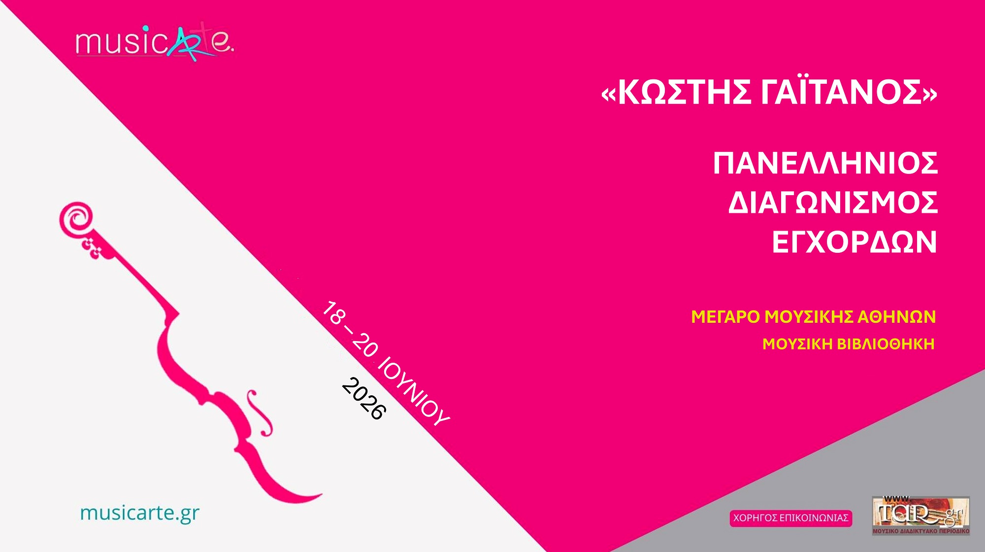Η Μουσική Εκπαιδευτική Ομάδα musicArte διοργανώνει και φέτος τους Πανελλήνιους Διαγωνισμούς Πιάνου, Κιθάρας και Εγχόρδων «Κωστής Γαϊτάνος», από 18 έως 20 Ιουνίου 2026, στο Μέγαρο Μουσικής Αθηνών. Οι διαγωνισμοί πραγματοποιούνται προς τιμήν του διακεκριμένου μουσικού και παιδαγωγού Κωστή Γαϊτάνου, αποτελώντας πηγή έμπνευσης για τις νέες γενιές μουσικών.