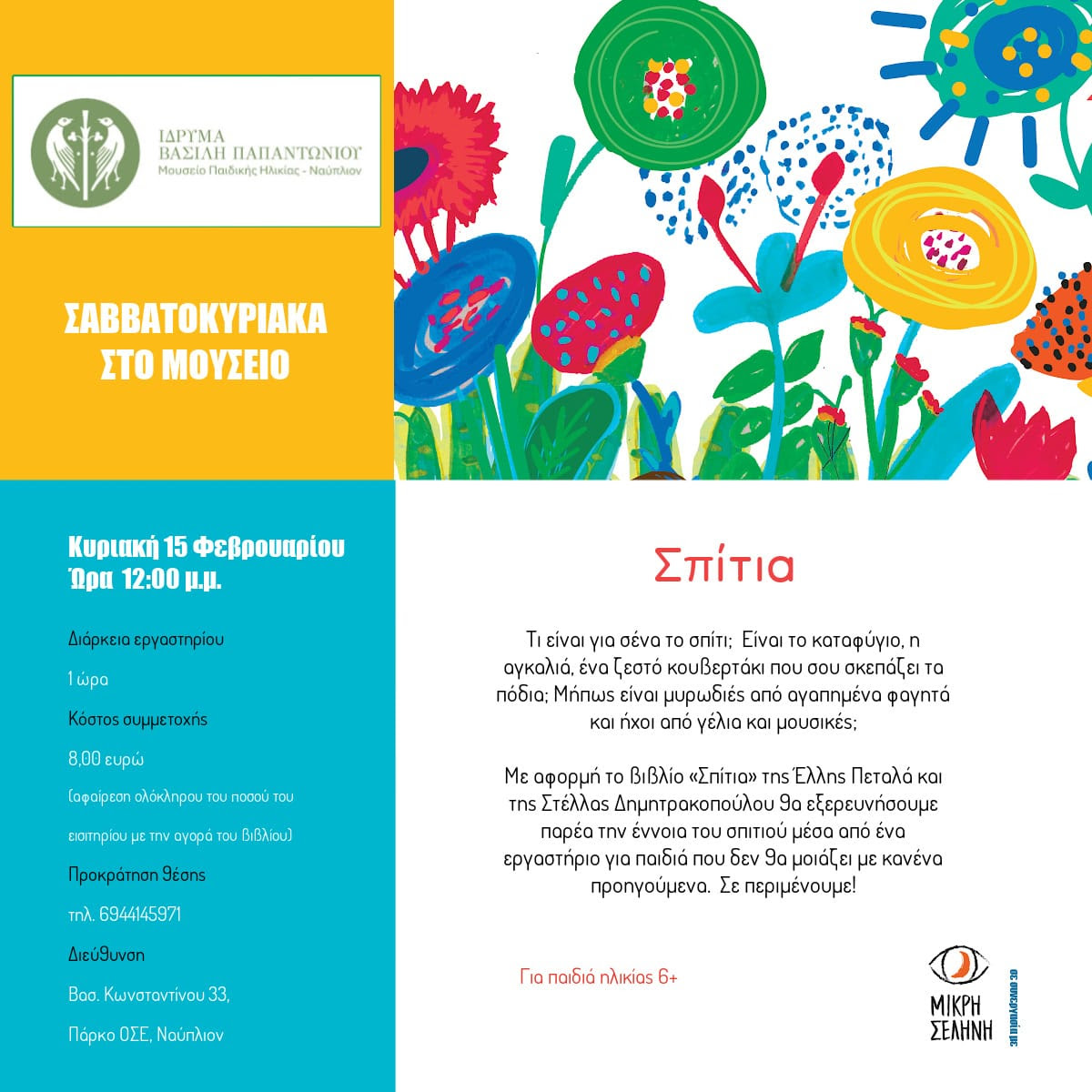 Την Κυριακή 15 Φεβρουαρίου 2026, στις 12:00 μ.μ., μικροί φίλοι ηλικίας 6 ετών και άνω θα έχουν την ευκαιρία να εξερευνήσουν την έννοια του «σπιτιού» μέσα από παιχνίδι, φαντασία και δημιουργικές δραστηριότητες. Το εργαστήριο, διάρκειας μίας ώρας, σχεδιάστηκε ώστε να ενθαρρύνει την έκφραση, τη συνεργασία και τη σύνδεση των παιδιών με προσωπικές εμπειρίες και συναισθήματα.