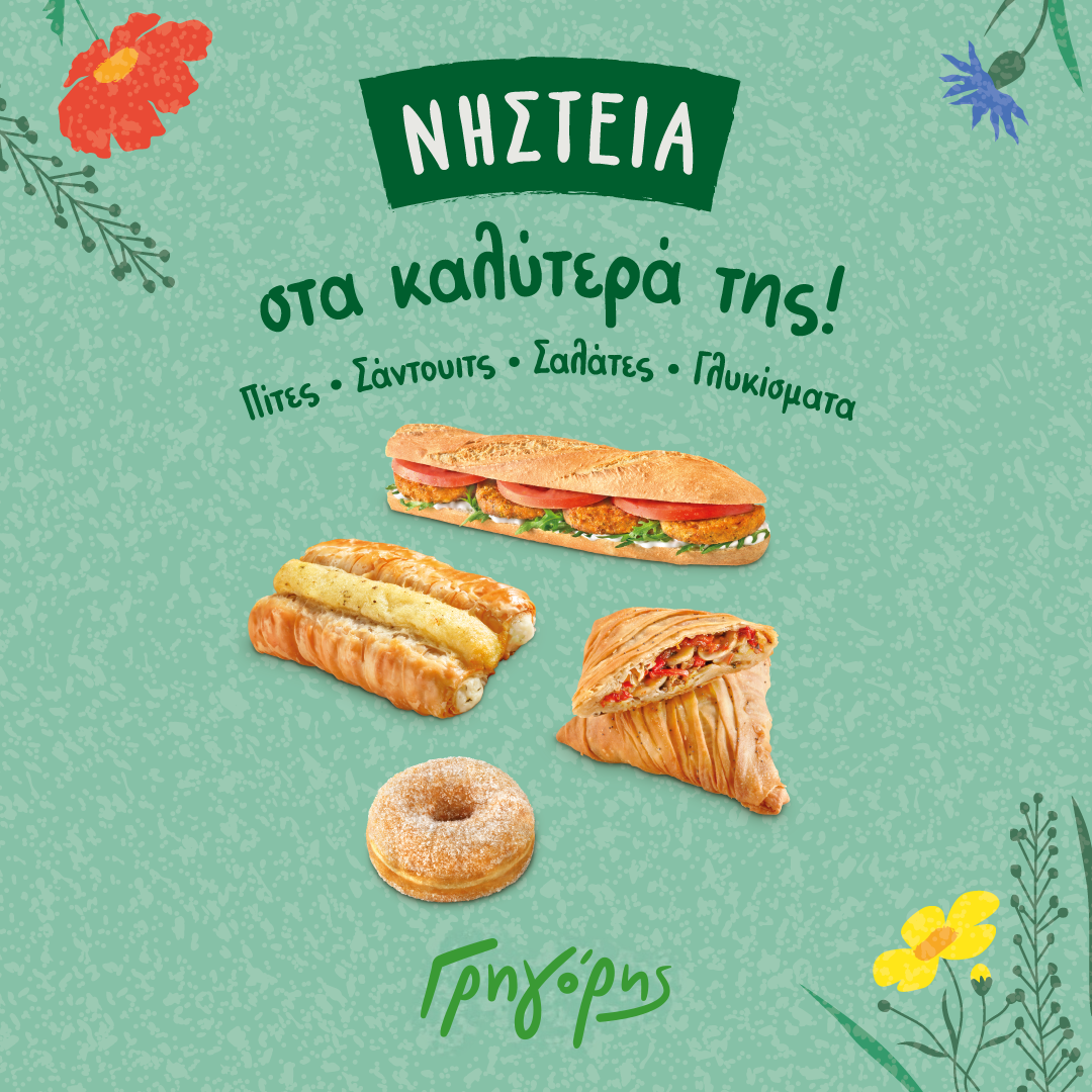 Η γλυκιά πλευρά της νηστείας εκπροσωπείται επάξια από το κουλούρι με χαρούπι και ταχίνι, τους λουκουμάδες και τα cookies βρώμης με μέλι. Παράλληλα, ο Γρηγόρης καινοτομεί στην κατηγορία του καφέ, προσφέροντας Vegan Cappuccino και Freddo Cappuccino με μια μεγάλη ποικιλία φυτικών ροφημάτων (αμυγδάλου, βρώμης, σόγιας, καρύδας), ενώ τα συσκευασμένα σνακ, όπως οι μπάρες και τα παστέλια, συμπληρώνουν τις On-the-Go επιλογές.